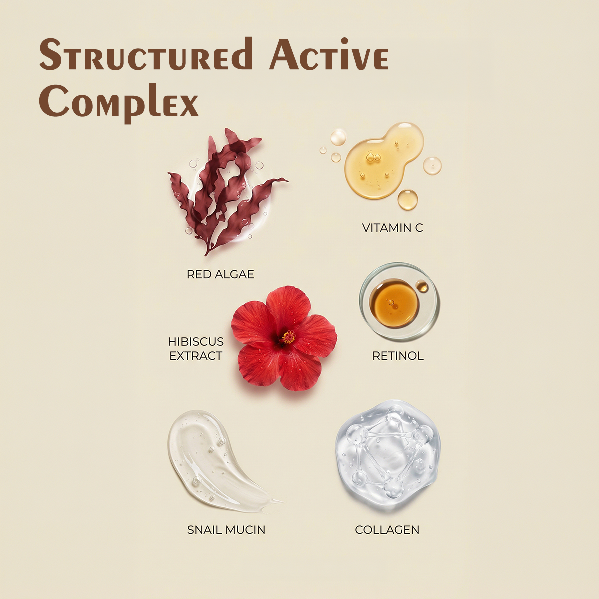 This serum is powered by a multi-active complex including Vitamin C (SAP), Retinol, Collagen, Hyaluronic Acid and Snail Mucin.